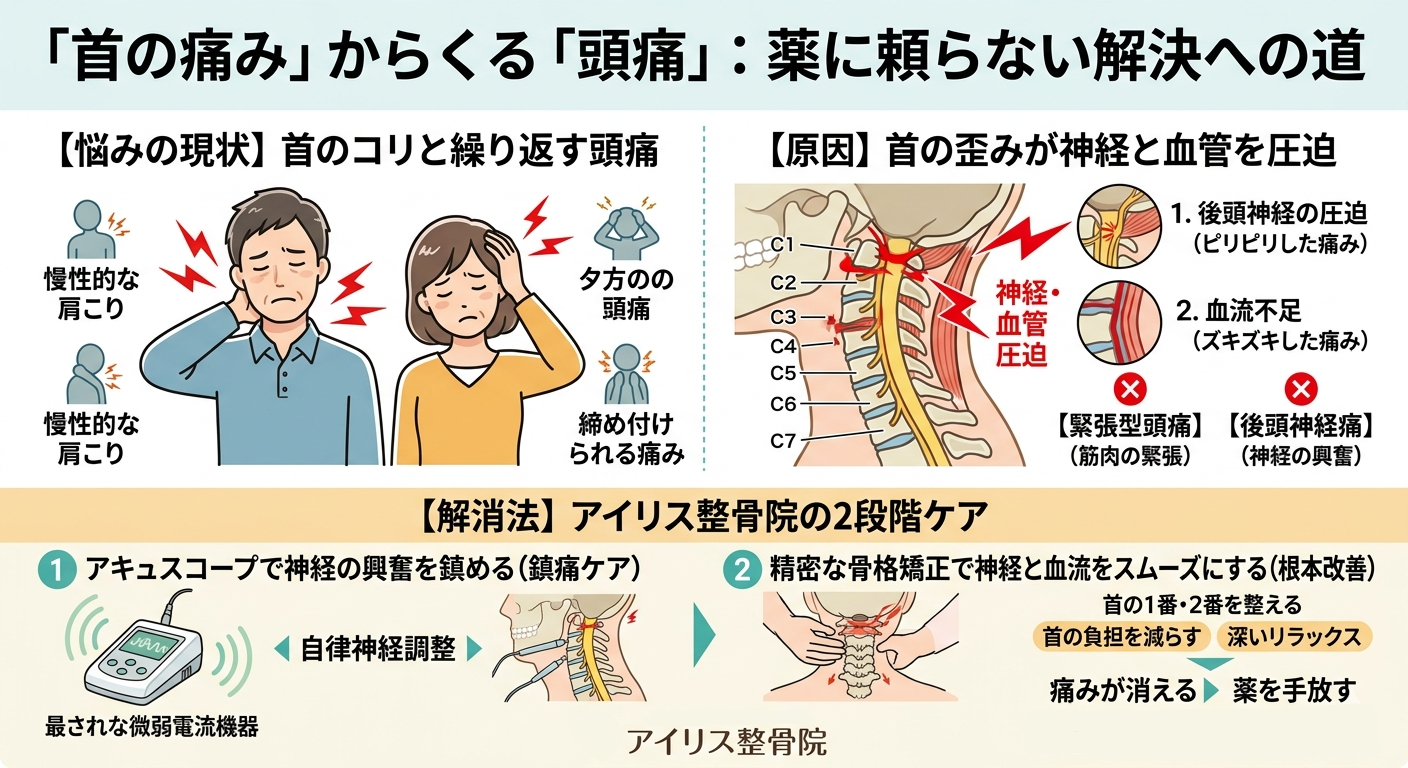「頭痛薬を飲んでしのいでいるけれど、根本から治したい」 そう願うあなたへ。2008年開業のアイリス整骨院が、首からくる頭痛の正体と、その解消法を詳しく解説します。