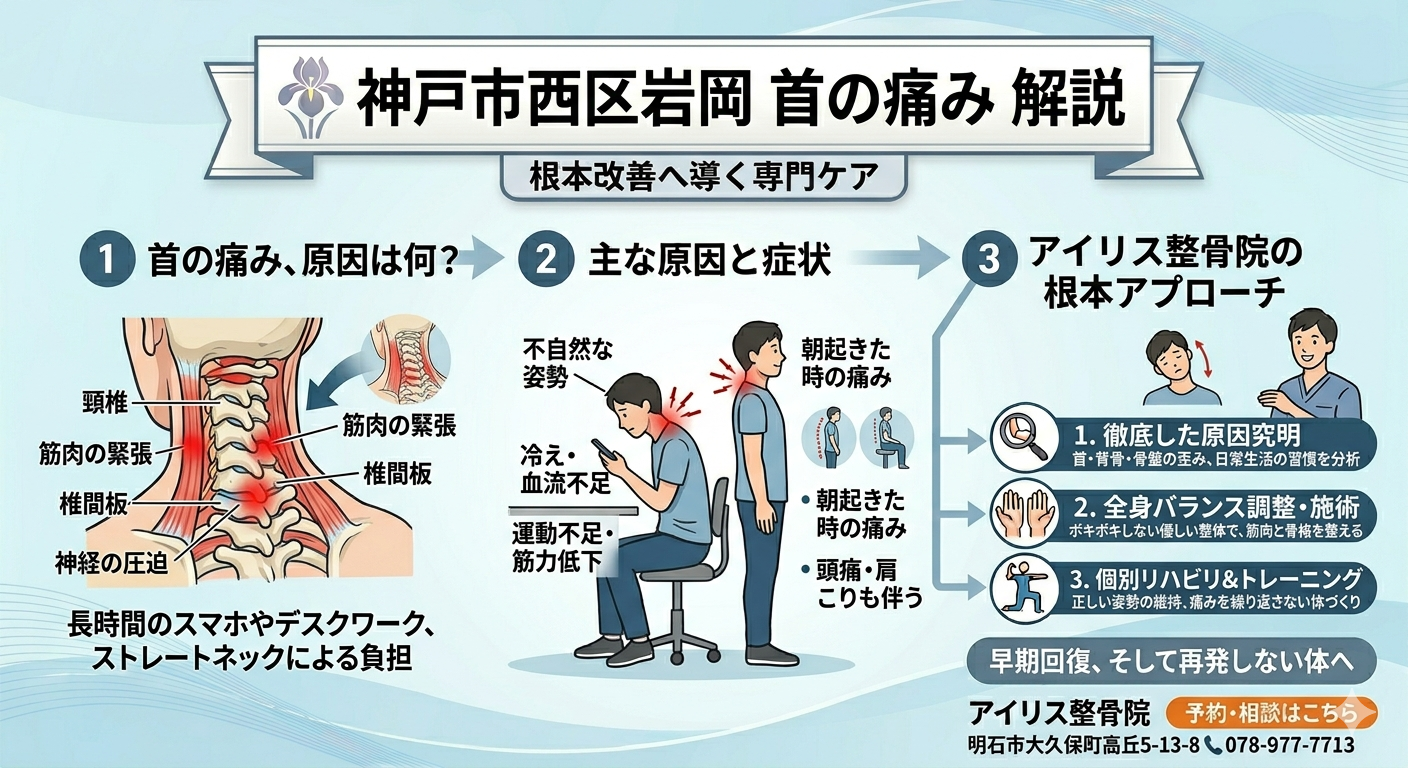 岩岡周辺は静かで住みやすい地域ですが、お仕事での長距離運転や農作業、あるいは長時間のデスクワークなどで首を酷使されている方が非常に多いです。 「どこへ行けばいいかわからない」と遠くの病院まで通う前に、すぐ隣の大久保町高丘にあるアイリス整骨院へご相談ください。